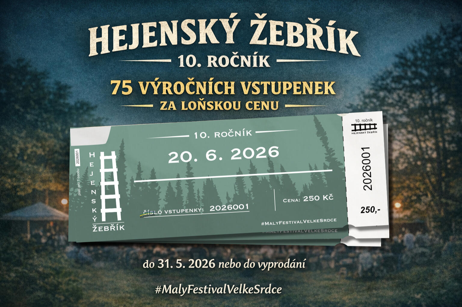 K výročí pro vás máme 75 výhodných vstupenek za loňskou cenu 250 Kč.Pokud chcete mít svůj lístek pěkně v teple e-mailové schránky a být u toho s námi od začátku, budeme moc rádi.Předprodej končí 31. 5. 2026 nebo po vyprodání limitu 75 kusů.Instrukce k nákupu najdete zde 👇