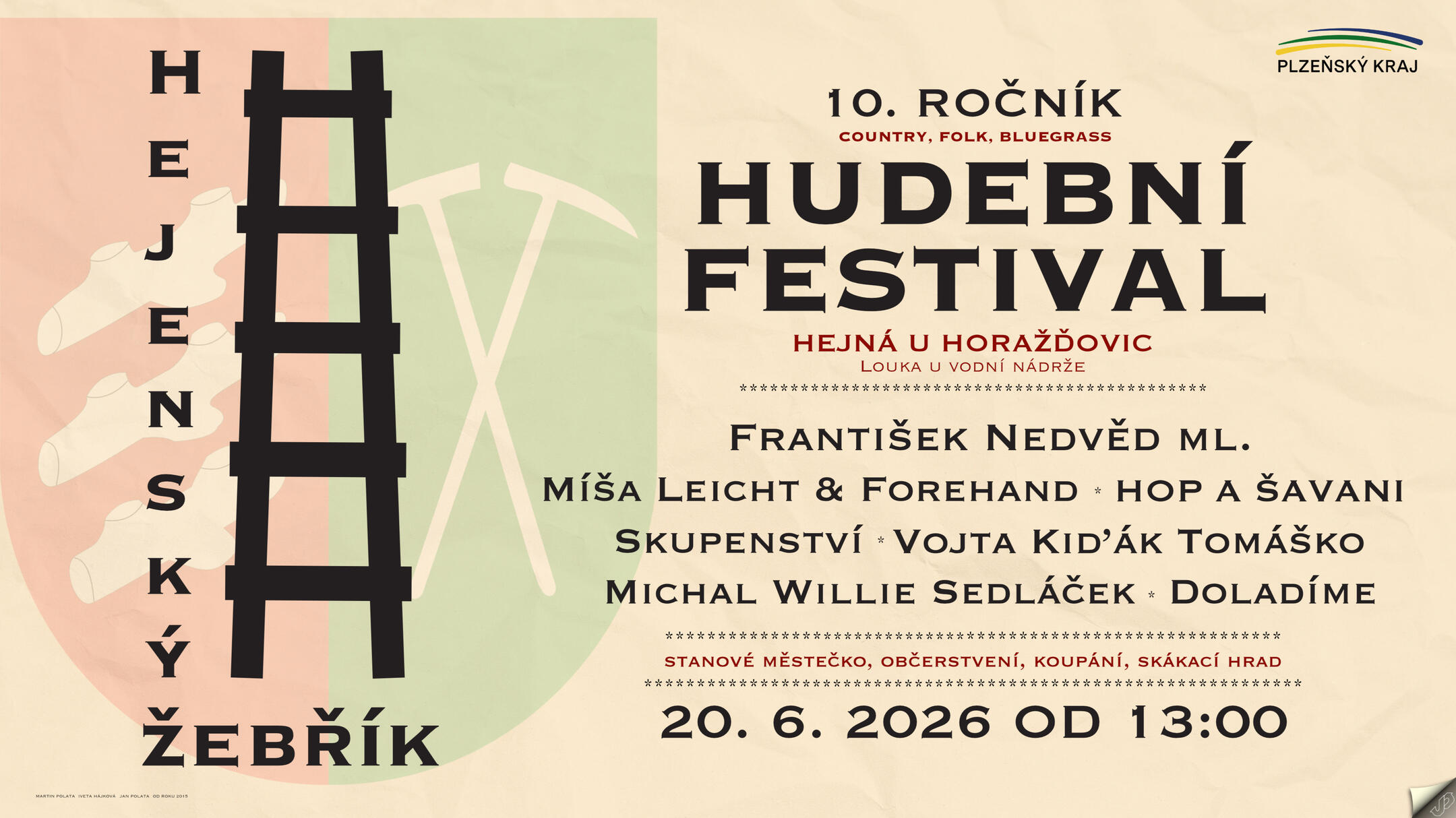 Program 10. ročníku Hejenského žebříku nabídne průřez současnou folkovou, country a bluegrassovou scénou. Níže naleznete pořadí vystoupení a orientační časy jednotlivých kapel.13:00 - DOLADÍME